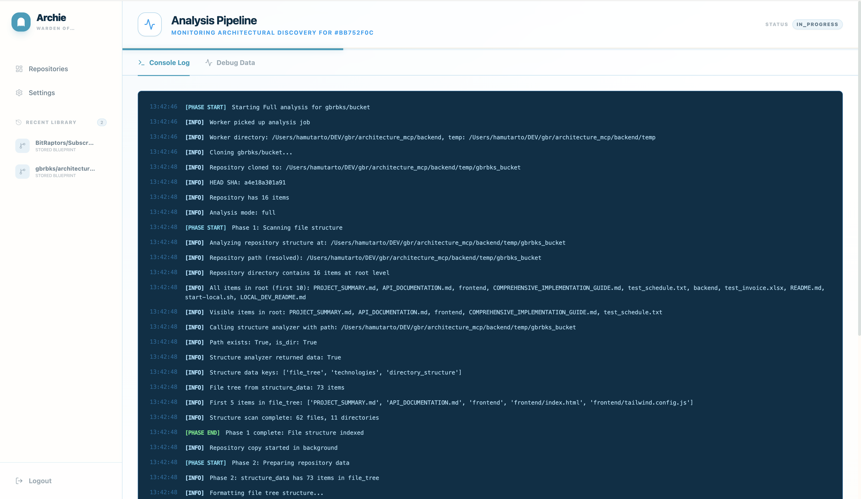 Other tools scan your package.json and call it a day. Archie runs a deep AI analysis pipeline: observation, discovery, implementation analysis, and synthesis.
